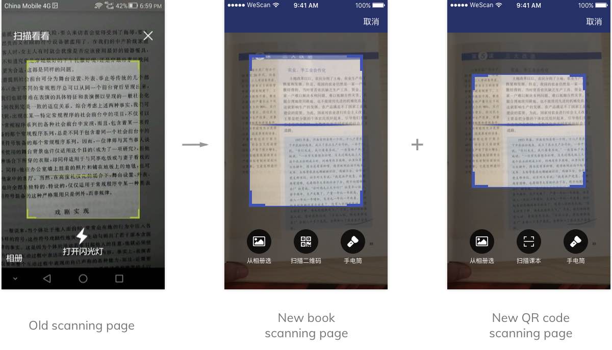 My solution was to use scanning frames with different ratios. For textbooks, I used a 3:4 frame, which is the shape of most books. For QR codes, I used a 1:1 frame to remind users that they were supposed to scan QR codes.